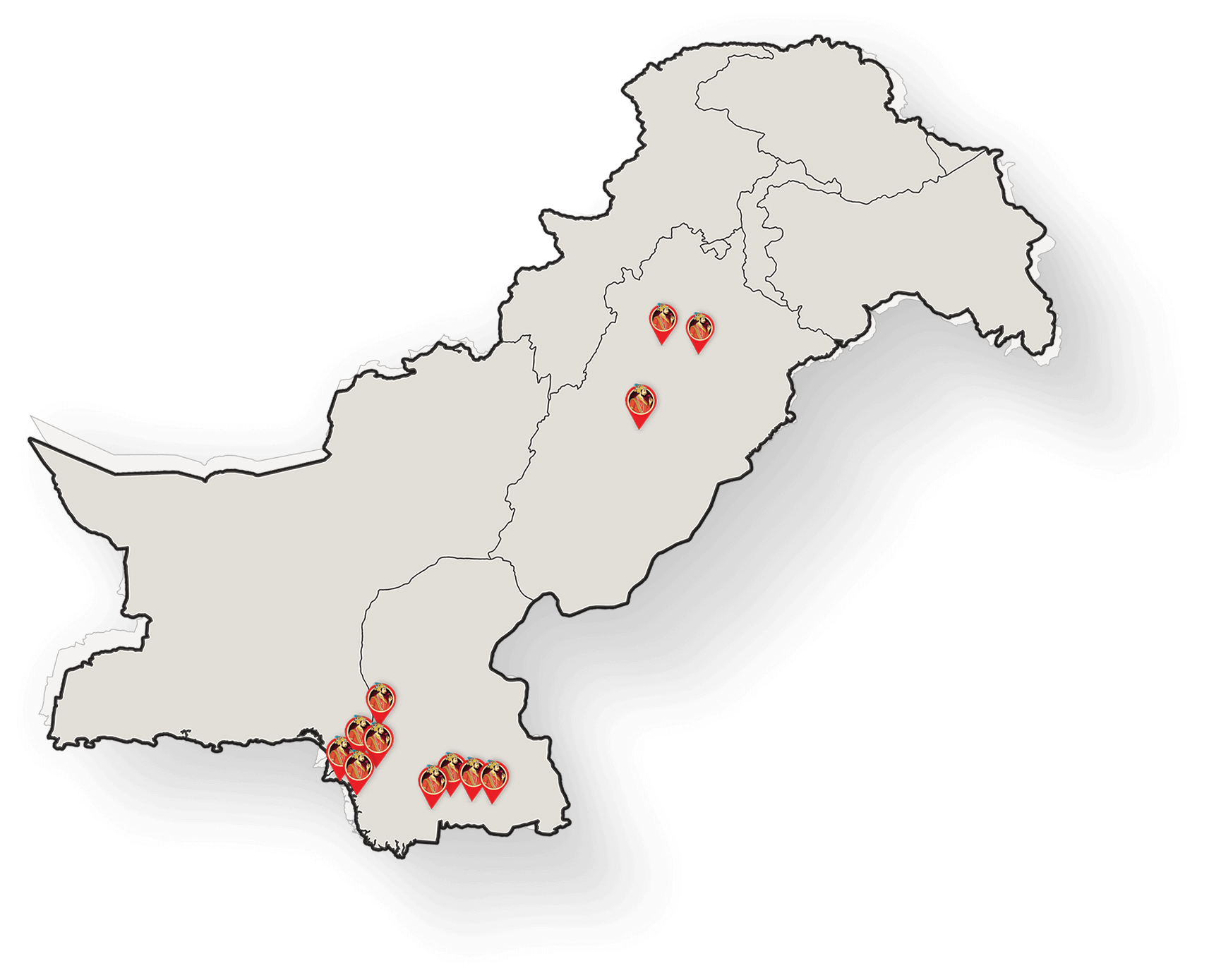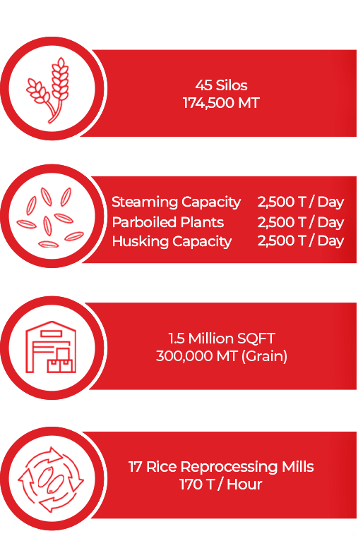 We have 50 comprehensive drying plants. Our mills, processing and reprocessing facilities, paddy storage, and warehouse facilities are located in various areas including Port Qasim, Dhabeji, Gharo, TMK, Khorwah, Golarchi, Sultanabad, Sujawal, Thul, Chaubara, Sheikhupura, and Kot Pindidas. These facilities are spread over 350 acres of land, making it a substantial structure in Pakistan.