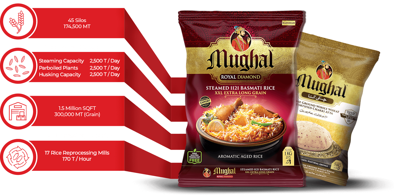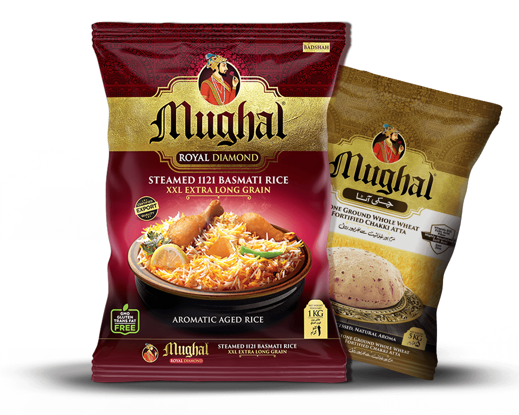 Mughal is a world-renowned brand of rice and wheat flour by Garibsons and is one of the largest-selling brands in all modern trade outlets in Pakistan and is internationally registered and marketed across 80+ countries worldwide. Mughal is geared towards various price ranges with the simple guarantee that our rice grain is extra long and aromatic. On the other hand, Mughal wheat has both a high protein and gluten content, which is popular in the international market, making Garibsons 1st in the list of Top Rice Exporters of Pakistan for the last 20 years and 5th Largest Basmati Rice Exporter.